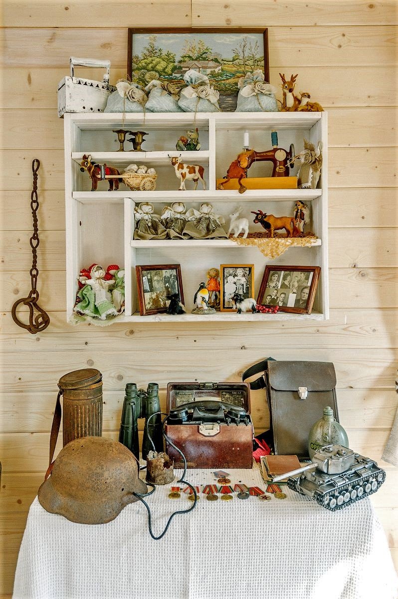 Здесь вы увидите боёчки для масла, ступы, прялки, чугунные утюги, вышитые рушники, тканые вручную покрывала и другие предметы, без которых невозможно представить жизнь белорусской деревни. Есть даже небольшой военный уголок с находками времён Великой Отечественной войны, обнаруженными прямо на территории усадьбы.